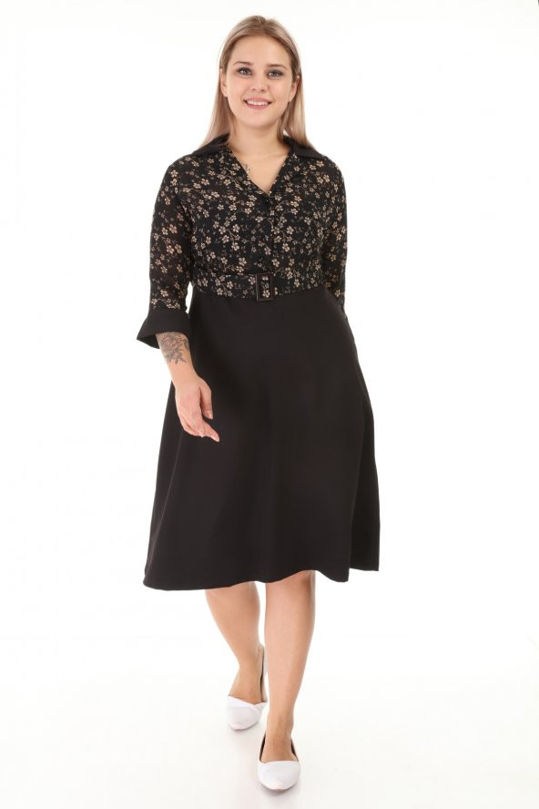 Lir Kadın Büyük Beden Kemerli Truvakar Kol Ofis Elbise Siyah 1629