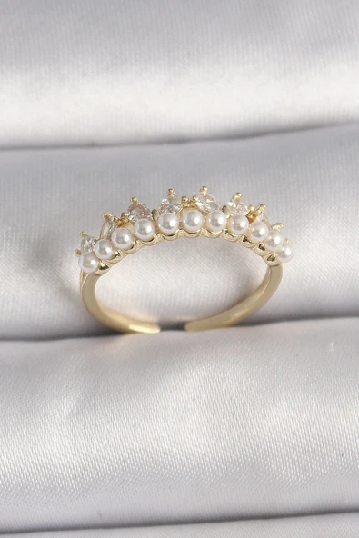 Litae Trend BFS Pirinç Gold Renk Zirkon Taşlı İncili Taç Model Ayarlanabilir Kadın Yüzük