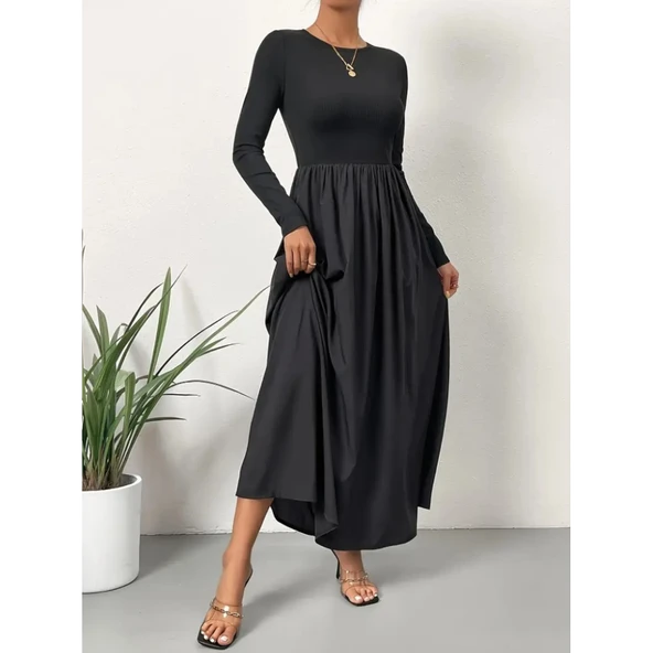 Lucky Life Kadın Uzun Kollu Bisiklet Yaka Uzun üst Viskon Alt Trikoton Elbise