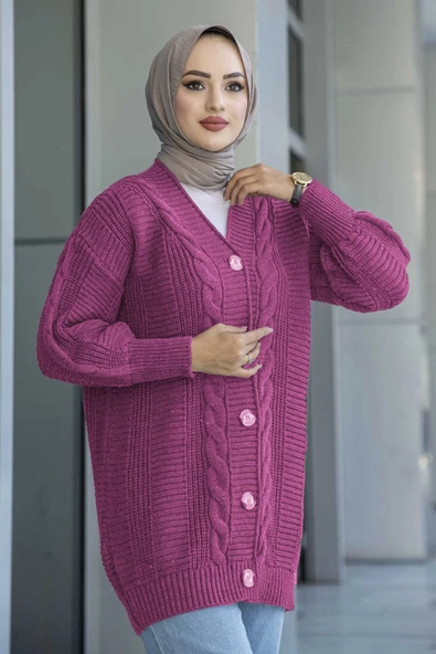 - Lugmo Kadın Tesettür Triko Hırka 5 Düğmeli Saç Örğülü Hırka Fuşya