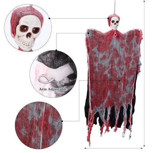 Led Işıklı Kahkaha Atan Sesli Sensörlü Ürpertici Kuru Kafa Kanlı Korku Hayalet Saçaklı Dekor 90x50 cm