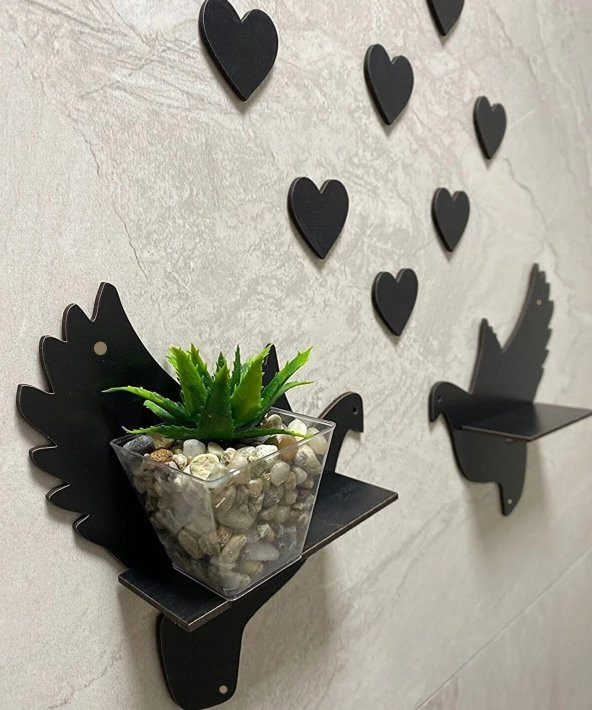 Çifte Kumru Ahşap 2li Güvercin Duvar Rafı Ve 10 Adet Kalp Duvar Dekoru