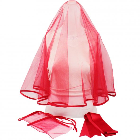 Biyeli Kına Duvağı Gelin Örtüsü Seti Kırmızı Sade Duvak