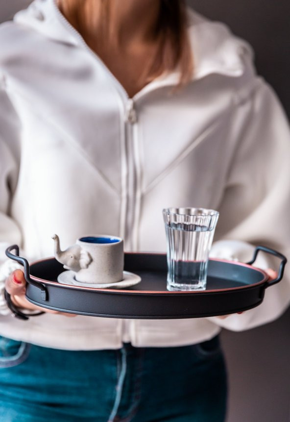 26 cm Bakır Kenarlı Oval Siyah Country Tarzı Dekoratif Tepsi