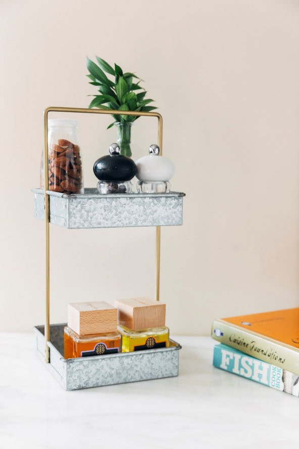 Country Tarzı Galvaniz Altın Rimli Kare 2 Katlı Sunum Tabağı Düzenleyici