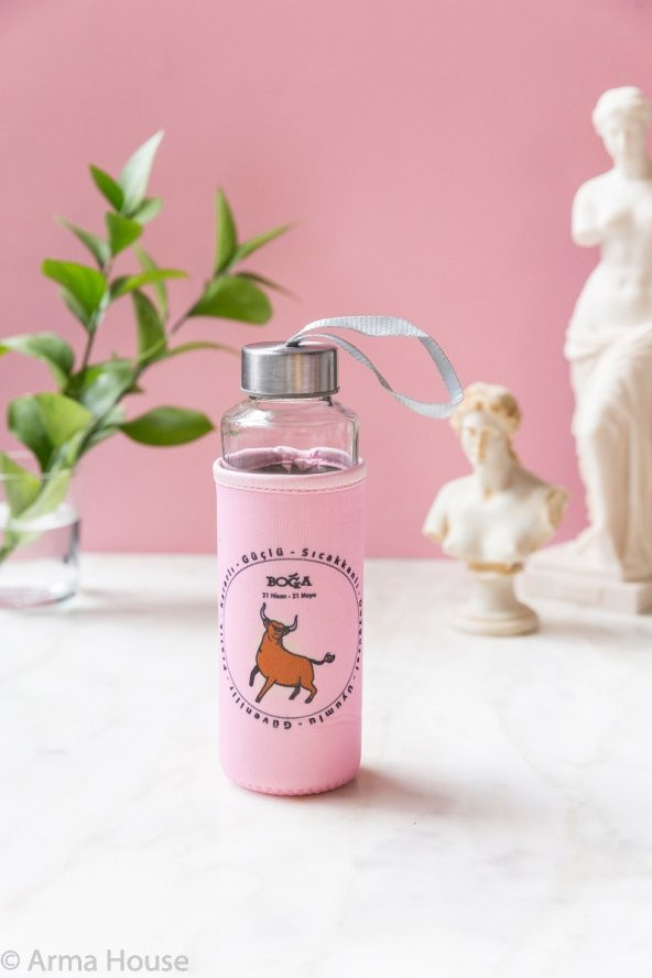 Pembe Boğa Burcu Kılıflı Cam Matara 400ml