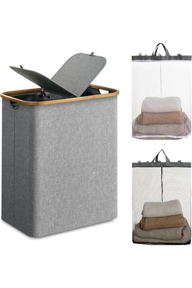 Mien Bambu Kenarlı Kumaş Katlanabilir 150 Lt Çamaşır Sepeti 57x37x70