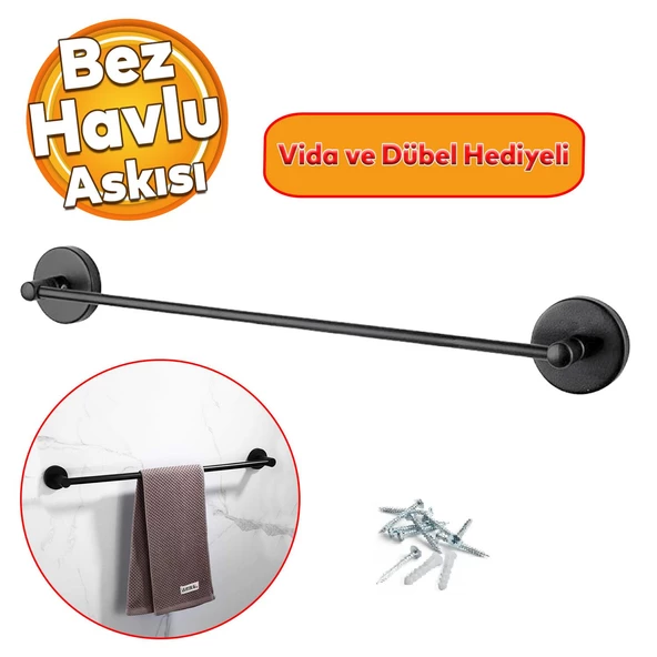 Vidalı Askılık Sağlam Askı Metal Siyah Bez Havlu Asma Askısı Aparatı 42 cm Banyo Lavabo