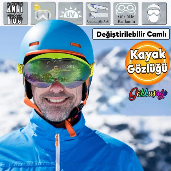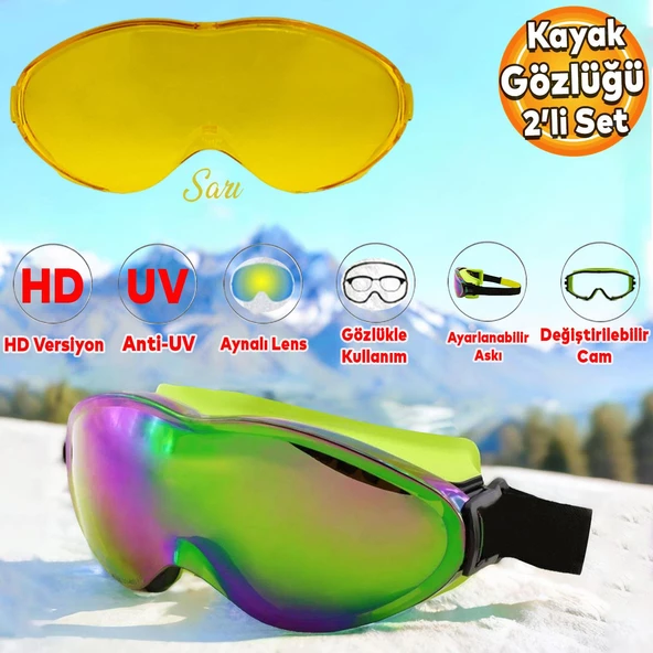 Bellasimo Kayak Gözlüğü Değiştirebilir Camlı Antifog Güneş Kar Gözlük Gökkuşağı Snowboard Glasses Gözlük+1 Adet Yedek Cam (Sarı)
