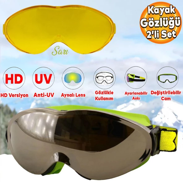 Bellasimo Kayak Gözlüğü Değiştirebilir Camlı Antifog Güneş Kar Gözlük Gümüş Snowboard Glasses Gözlük+1 Adet Yedek Cam (Sarı)