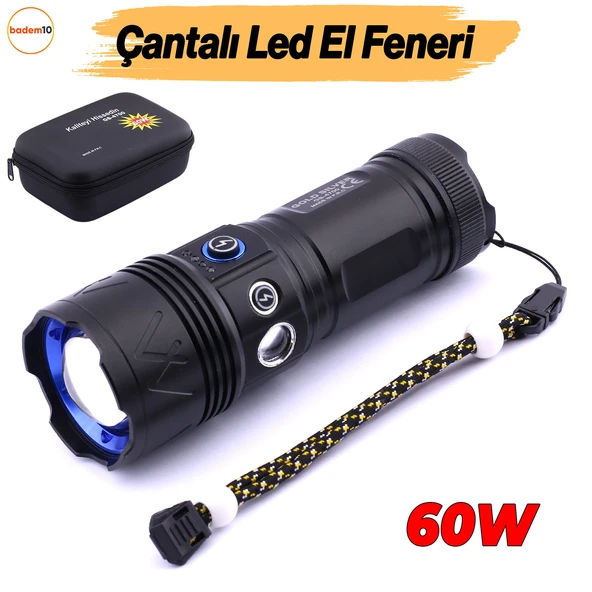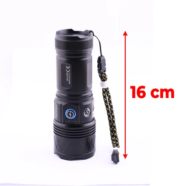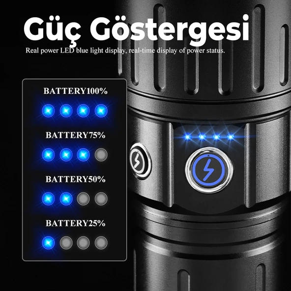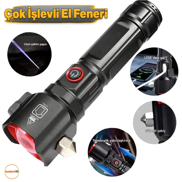 Şarjlı El Feneri | Yüksek Güçlü LED Işık | USB ile Şarj Edilebilir | Su Geçirmez Metal Gövde | Zoom Özellikli