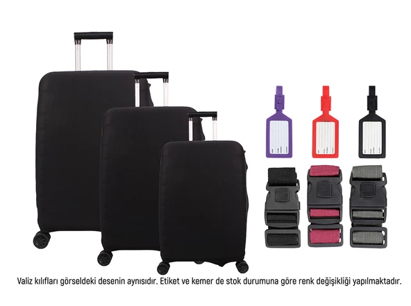 Bagacar Siyah 3lü Set Valiz Kılıfı, 3 lü Valiz Kemeri, 3lü Valiz Etiketi