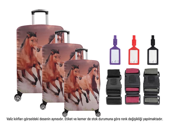 Bagacar Atlar 3lü Set Valiz Kılıfı, 3 lü Valiz Kemeri, 3lü Valiz Etiketi
