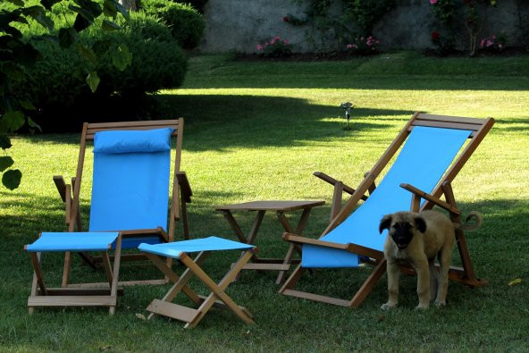 Mavi Su Geçirmez Kumaşlı ve Ayak Uzatma Tabureli Katlanır Ceviz Rengi Ahşap Şezlong Seti