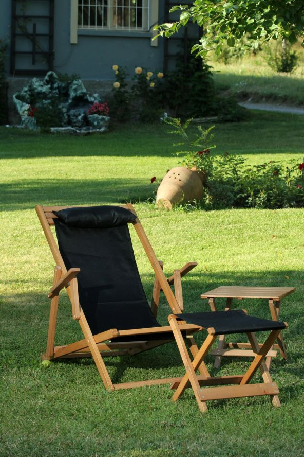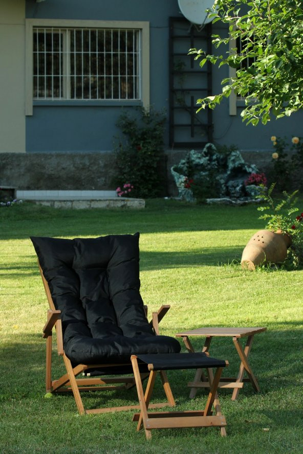 Siyah Suya Dayanıklı Minderli ve Ayak Uzatma Tabureli Katlanır Ahşap Şezlong