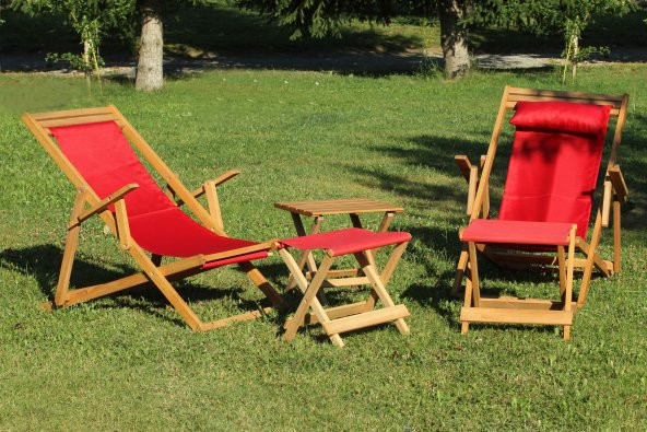 Su Geçirmez Kumaşlı ve Ayak Uzatma Tabureli Katlanır 2li Ahşap Şezlong Seti