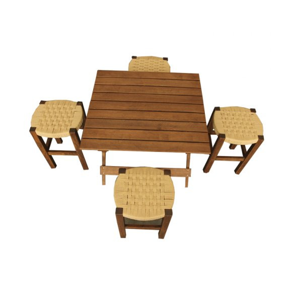 Ahşap Hasır Örgülü Büyük Boy Tabure ve Masa Seti, Piknik Seti, Balkon Katlanır Masa ve Tabure Seti