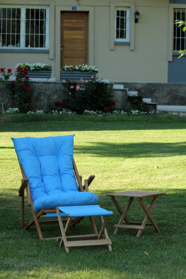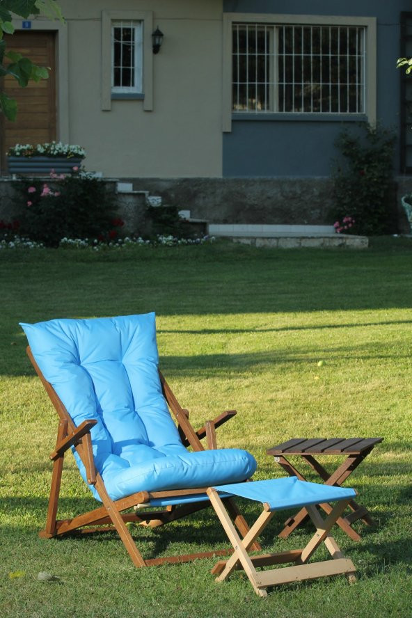Mavi Suya Dayanıklı Minderli ve Ayak Uzatma Tabureli Katlanır Ahşap Şezlong