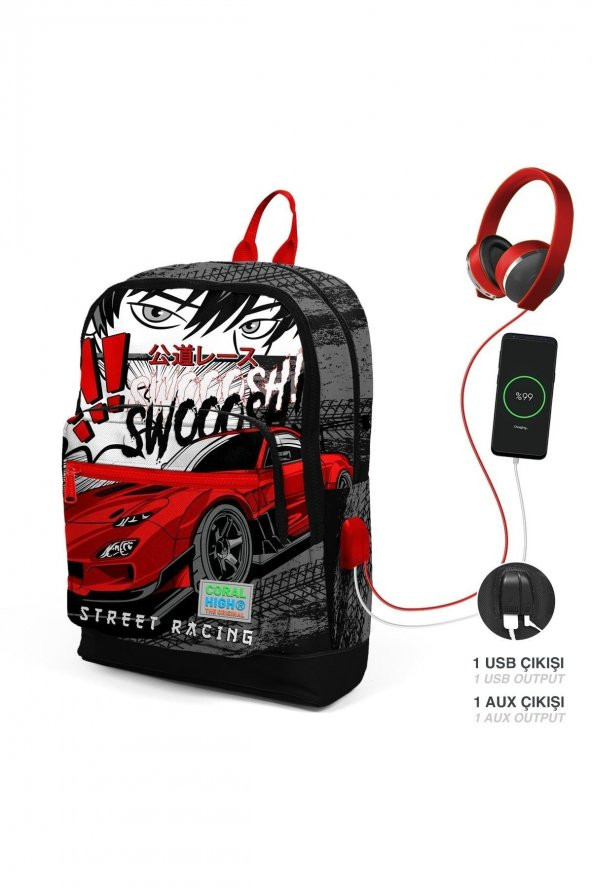Kids Siyah Kırmızı Anime Araba Desenli Dört Bölmeli Usbli Okul Sırt Çantası 23847