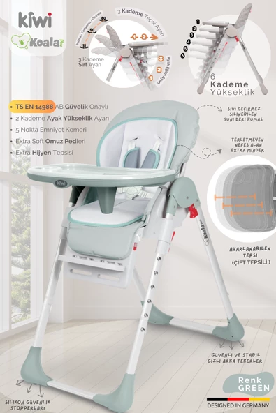 Kiwi Koala All in One Katlanır Tekerlekli Mama Sandalyesi Su Yeşili