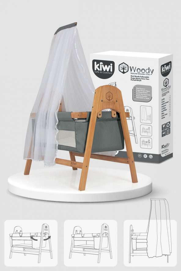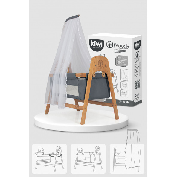 Kiwi Woody Sallanabilir Doğal Ahşap Anne Yanı Portatif Beşik Koyu Gri