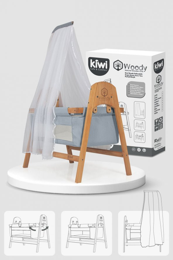 Kiwi Woody Sallanabilir Doğal Ahşap Anne Yanı Portatif Beşik Açık Gri