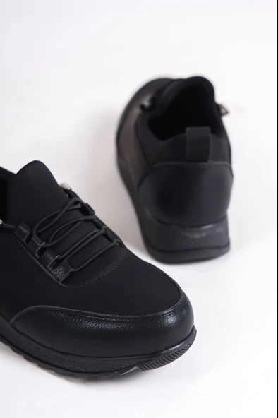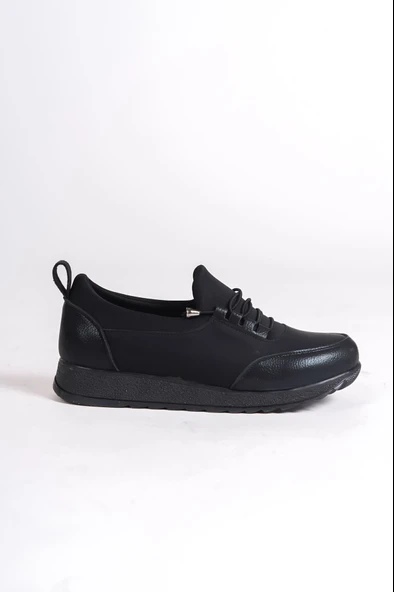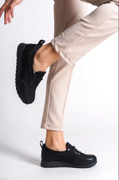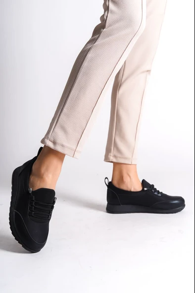 VIOLET Bağcıklı Lastikli Ortopedik Rahat Taban Cilt Detaylı Klasik Kadın Babet Anne Ayakkabısı CST - Siyah