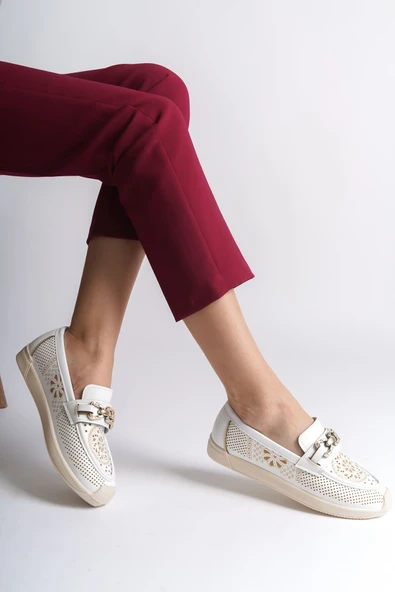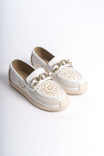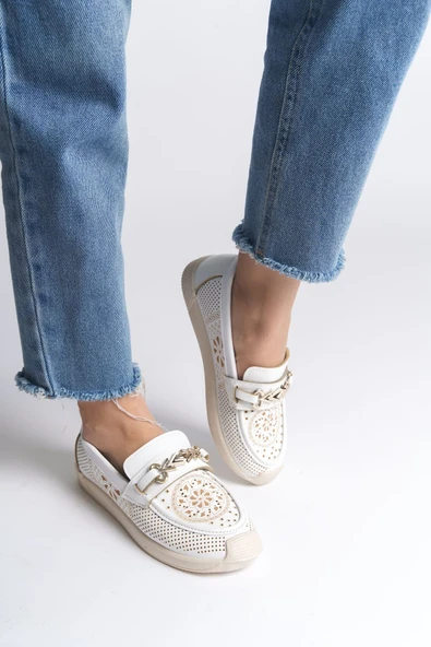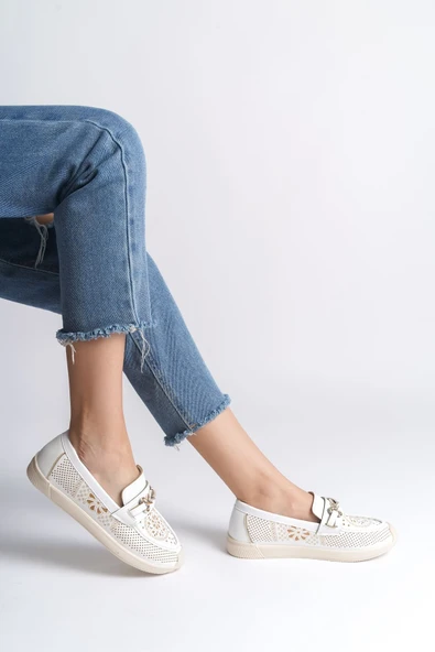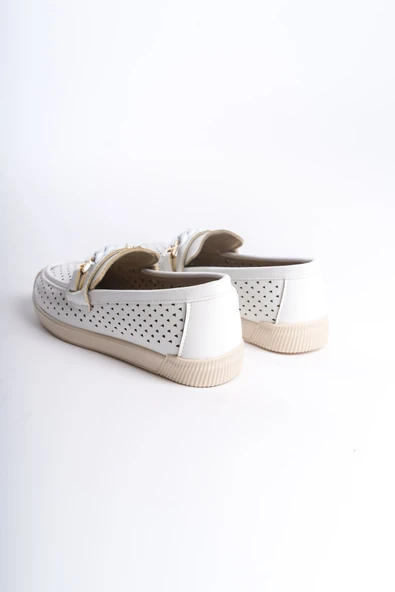 ALLISON Tokalı Ortopedik Rahat Taban Taş Detaylı Kadın Babet Ayakkabı CKT - Beyaz