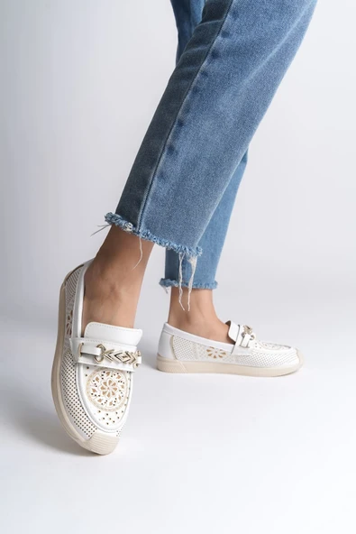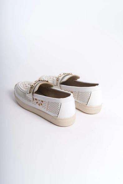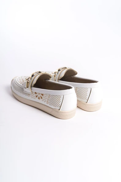 MONICA Tokalı Ortopedik Rahat Taban Taş Detaylı Kadın Babet Ayakkabı CKT - Beyaz