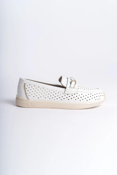 LAYLA Bağcıksız Ortopedik Rahat Taban Kalp Desenli Kadın Babet Ayakkabı CKT - Beyaz