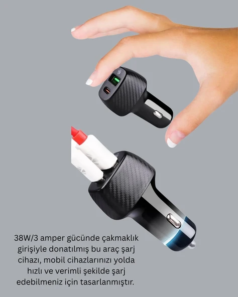 Araç İçi Şarj Cihazı 38W Güç Kapasiteli Type-C Girişli Araba Çakmaklık