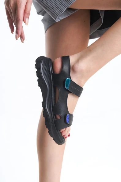 EVA Kalın Tokalı Taşlı Şeritli Ortopedik Taban Kadın Sandalet CST - Siyah