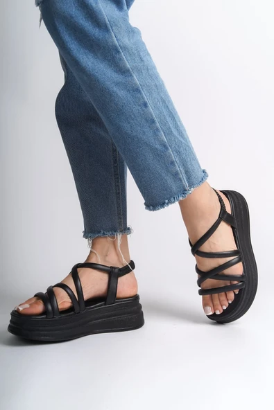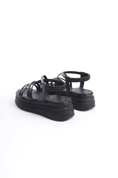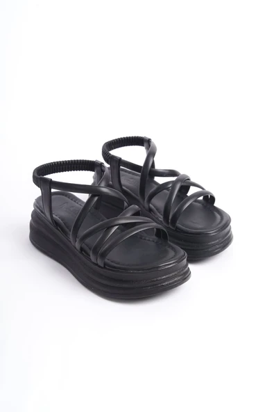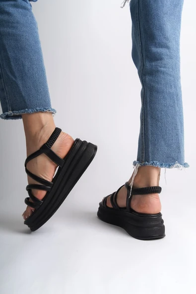 BELLA Lastikli Şerit Detaylı Ortopedik Taban Kadın Sandalet CST - Siyah