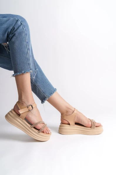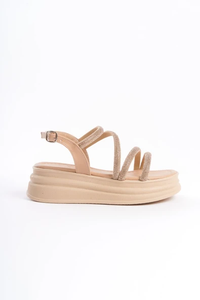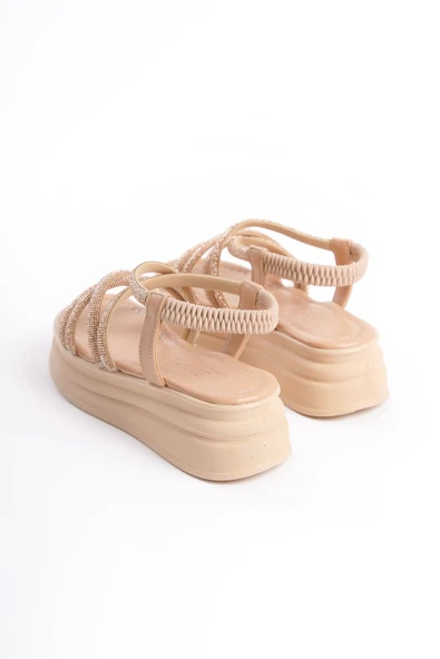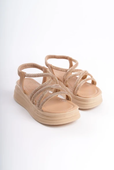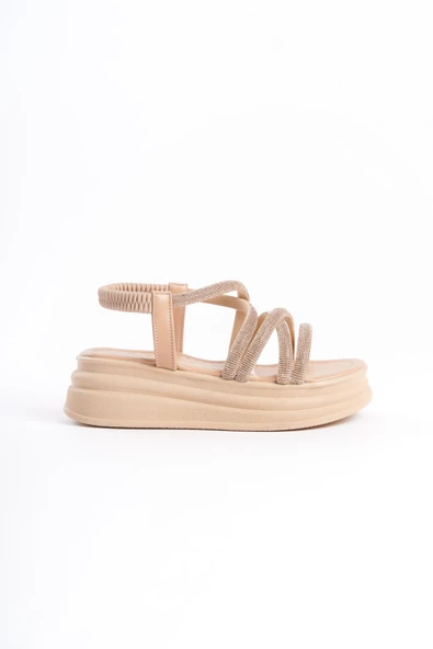 ELENA Lastikli Taşlı Şeritli Ortopedik Taban Kadın Sandalet CTT - Ten
