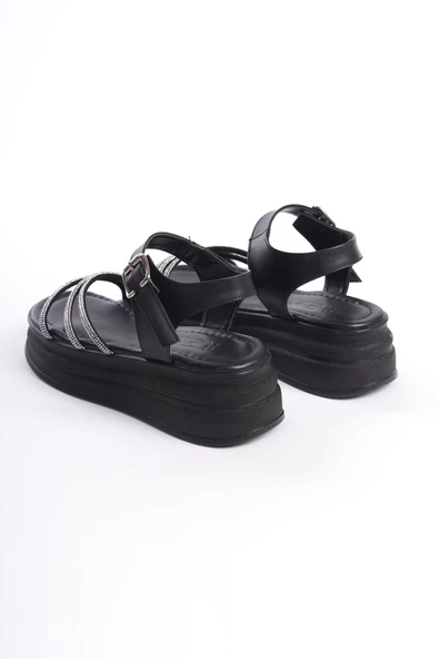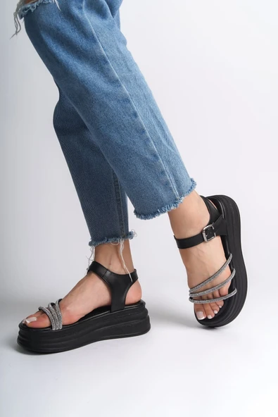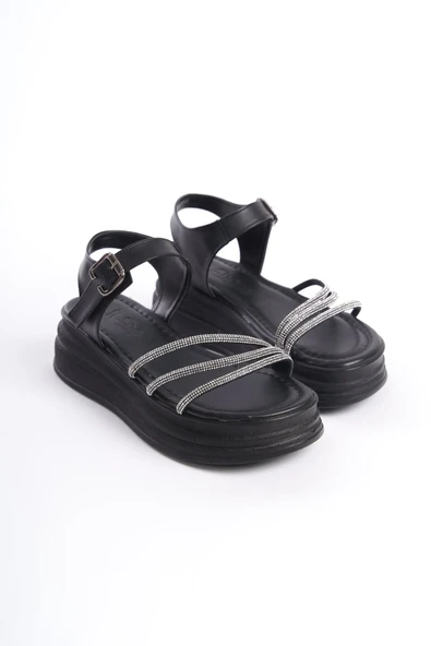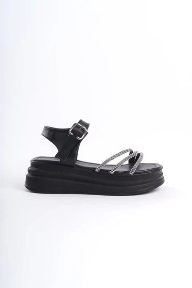 RILEY İnce Tokalı Taşlı Şeritli Ortopedik Taban Kadın Sandalet CST - Siyah