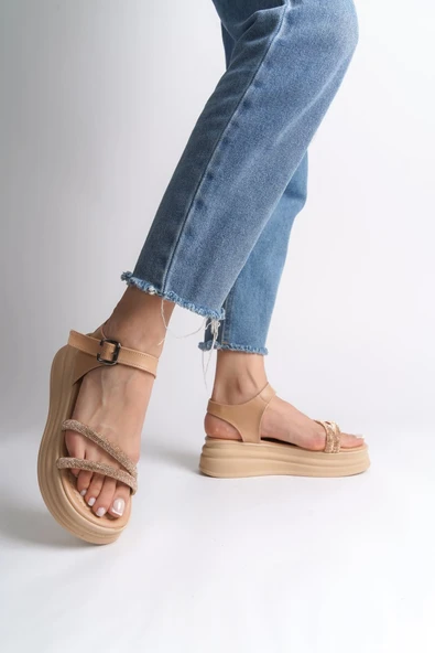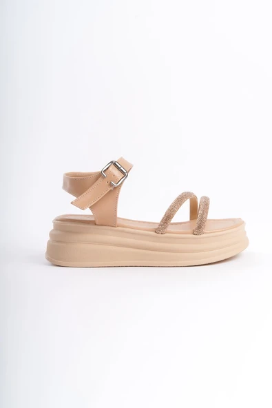 RILEY İnce Tokalı Taşlı Şeritli Ortopedik Taban Kadın Sandalet CTT - Ten