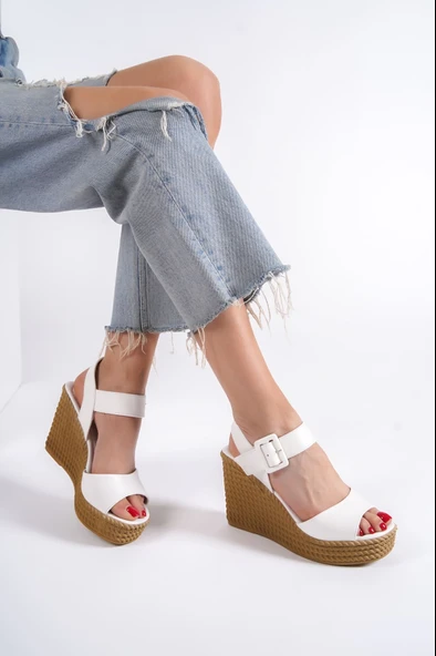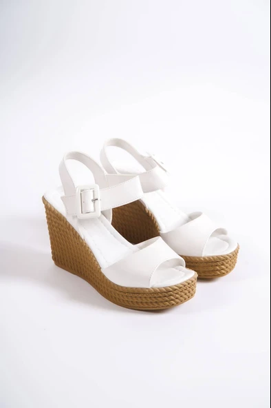 PERLA Tokalı Lastikli Dolgu Topuklu Ortopedik Taban Hasır Görünümlü Kadın Sandalet CKT - Beyaz