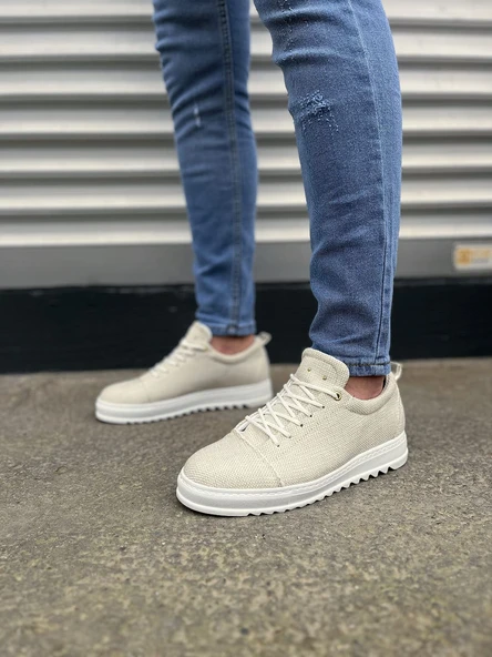 JY204 Flex Bağcıklı Keten Kumaş Erkek Günlük Sneaker Ayakkabı KKT - Krem
