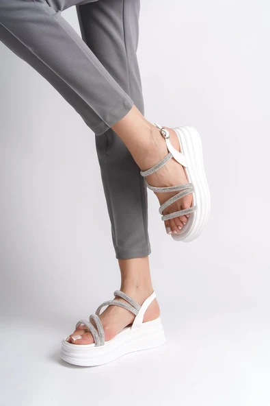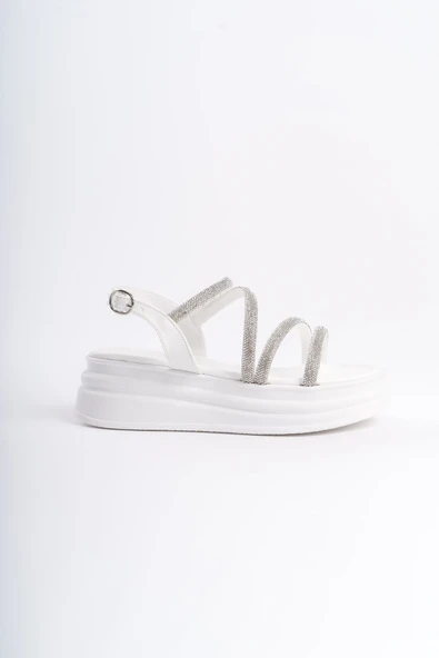 RILEY İnce Tokalı Taşlı Şeritli Ortopedik Taban Kadın Sandalet CBT - Beyaz