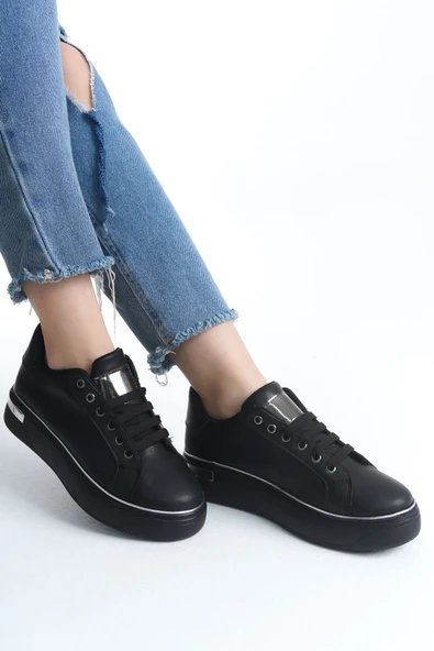 MINA Bağcıklı Ortopedik Taban Kadın Sneaker Spor Ayakkabı CST - Siyah/Gümüş