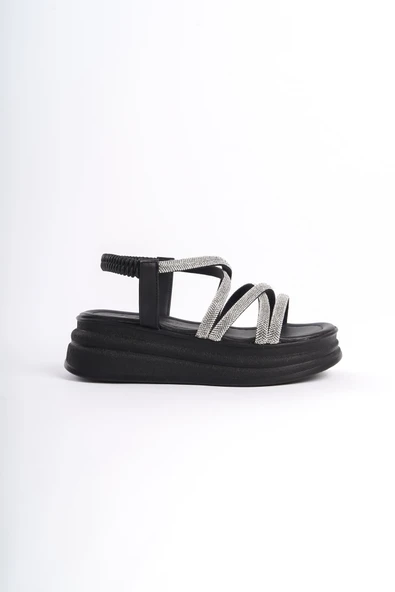ELENA Lastikli Taşlı Şeritli Ortopedik Taban Kadın Sandalet CST - Siyah