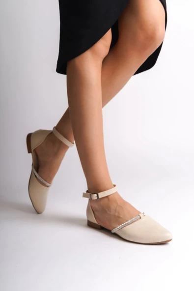 ARIANA Lastikli Ortopedik Rahat Taban Bilekten Taş Detaylı Kadın Babet Ayakkabı CKT - Krem