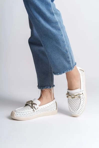 ALLISON Tokalı Ortopedik Rahat Taban Taş Detaylı Kadın Babet Ayakkabı CKT - Beyaz