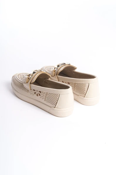 MONICA Tokalı Ortopedik Rahat Taban Taş Detaylı Kadın Babet Ayakkabı CKT - Krem