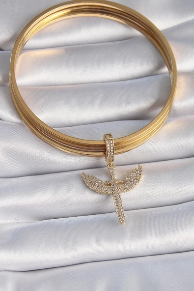 Pirinç Gold Renk Zirkon Taşlı Kanat Figür Asansörlü Makrome Model Kadın Bileklik