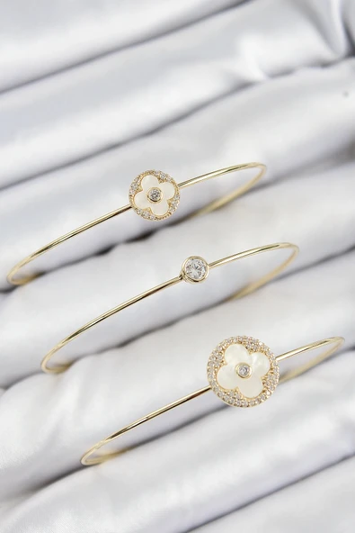 Pirinç Zirkon Taşlı Yonca Model Gold Renk Vip 3'lü Kadın Bileklik