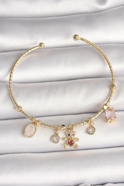 Pirinç Gold Renk Sallantı Zirkon Taşlı AYıcık Figür Kalp Detay Charm Kadın Bileklik