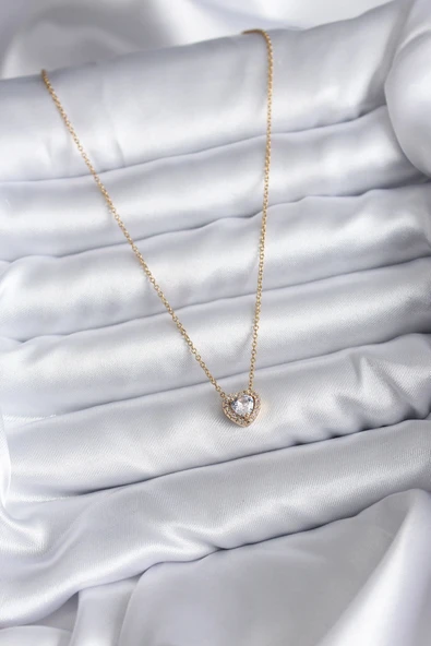 316L Çelik Zirkon Taşlı Kalp Model Gold Renk Kadın Kolye