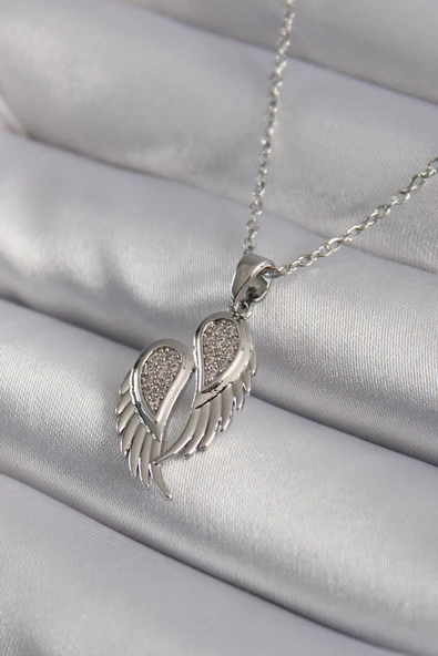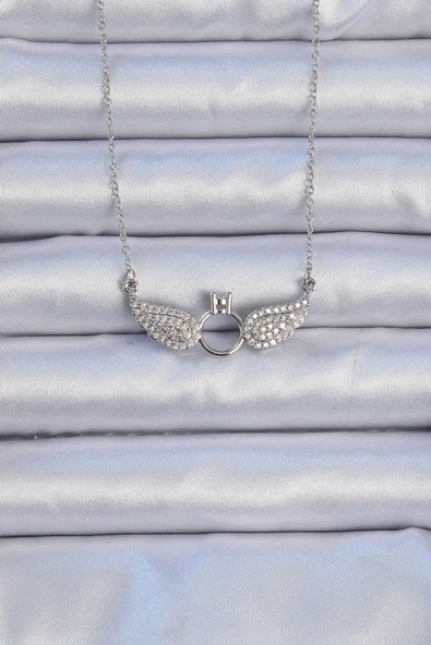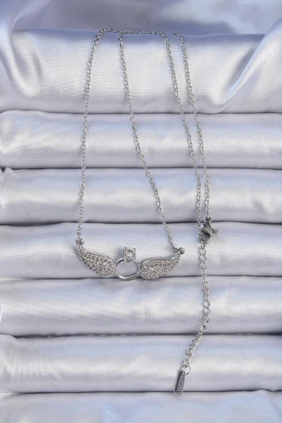 316L Çelik Gümüş Renk Zirkon Taşlı Kanat Model Kadın Kolye