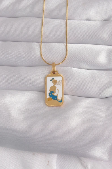 316L Çelik Gold Renk Beyaz Mineli Kız Figür Tarot Kolye